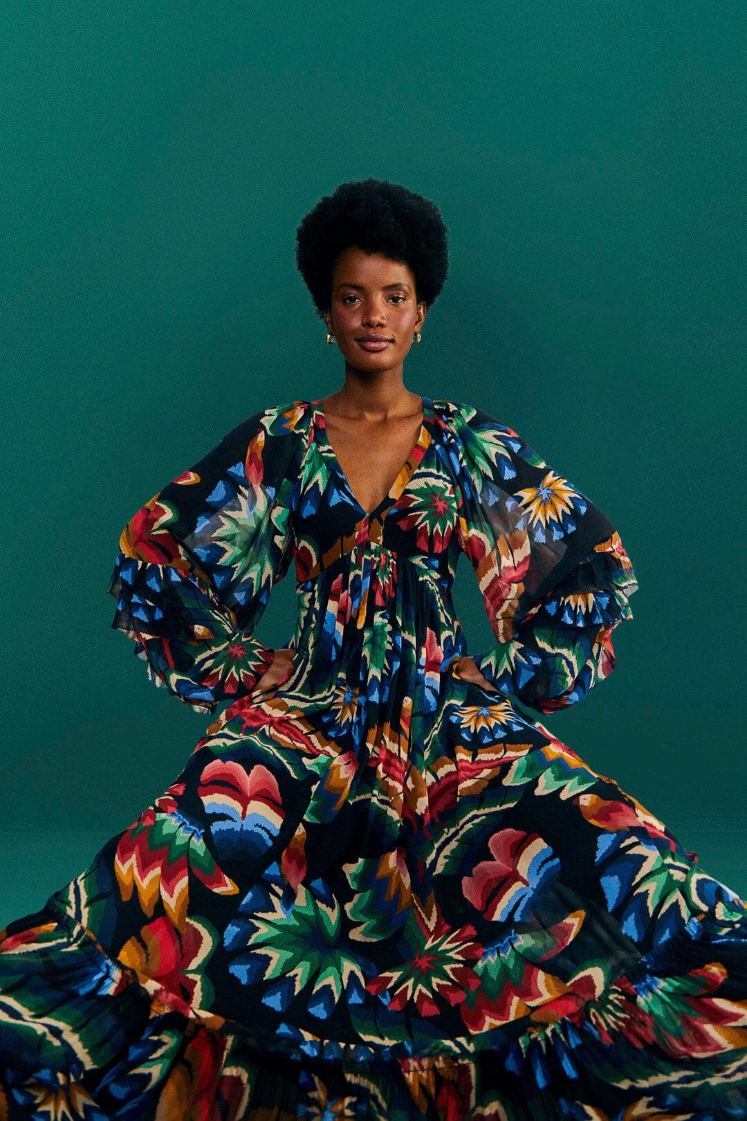 We can definitely call it a bright classic: the Black Chevron Forest Maxi Dress is here to be a timeless pick in your wardrobe. It has a flowy fit with long sleeves to deal with the breeze, a WOW back detailing, and a print with the nature-inspired vibe you love. So invite far-from-ordinary FARM Rio Shoes and accessories to make a bold impression all around 🙂